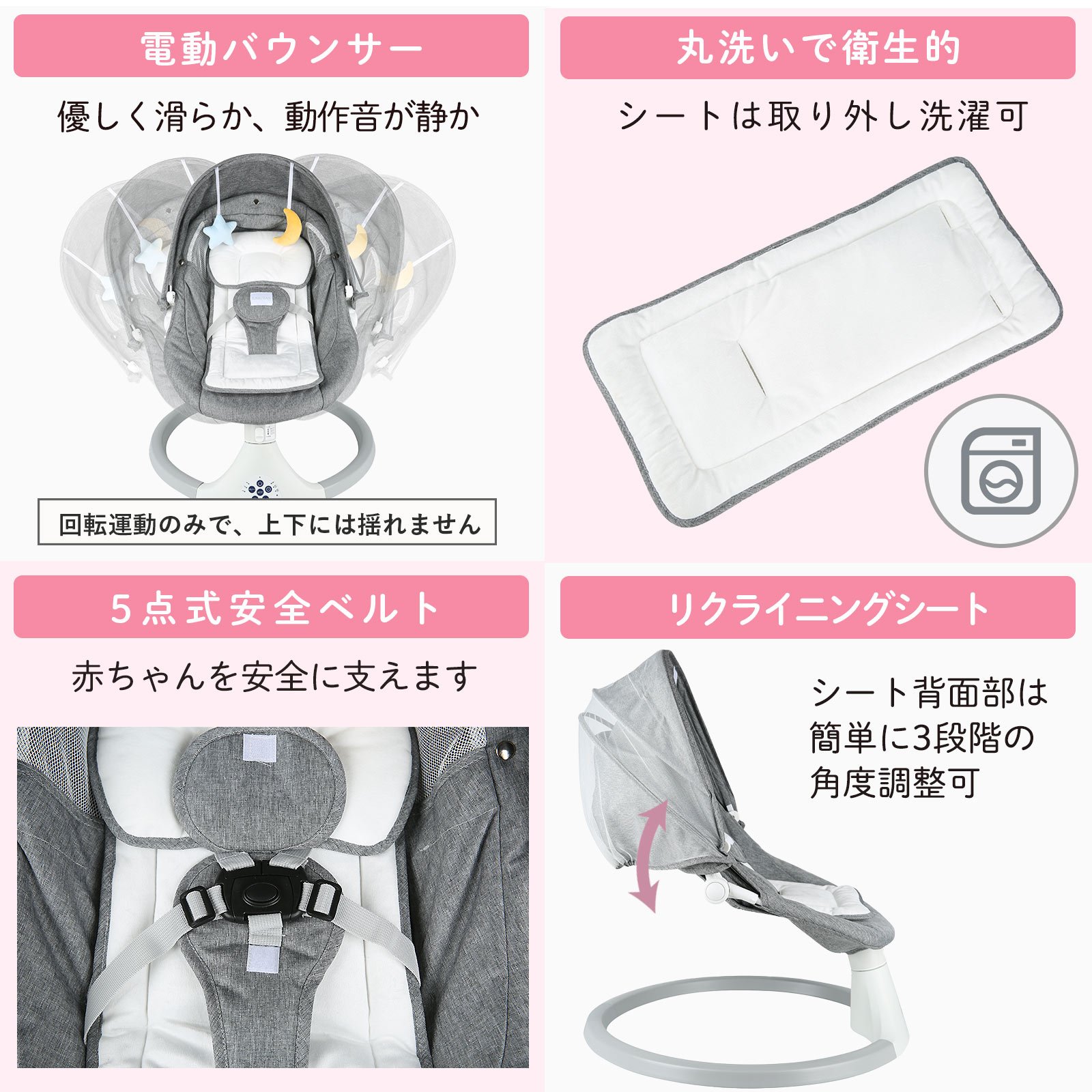【電動バウンサー】自動スイング時は優しく滑らか、動作音が静かです。(回転運動のみで、上下には揺れません)スイングの傾きを防ぐために、赤ちゃんはシートの中央に正しくに乗せてください。