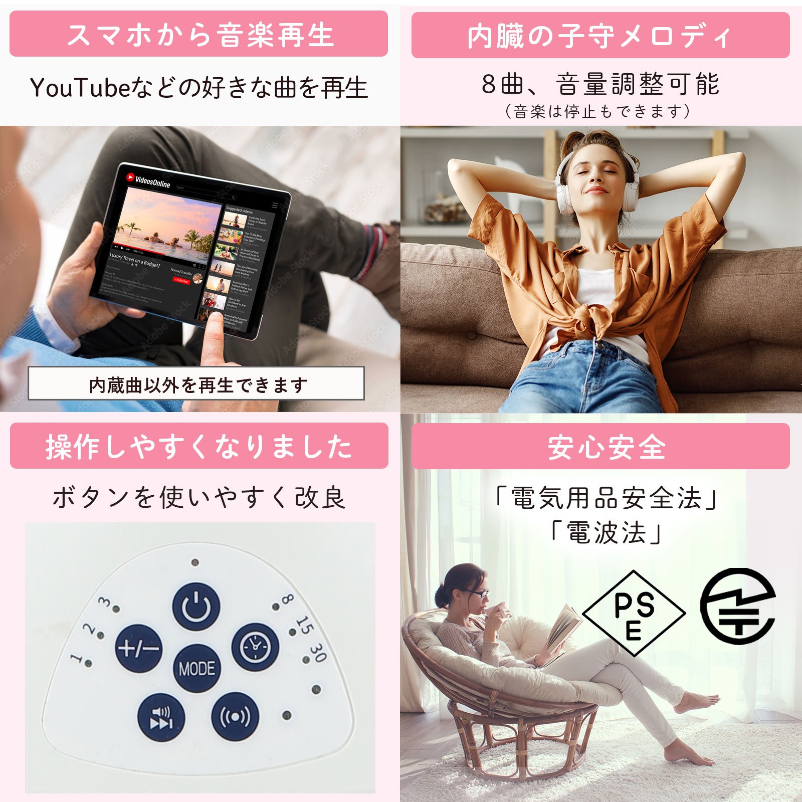 ・音がならないスイングが動かないなどの動作不具合がある場合は、コンセントを一度抜いて1分後に再度挿し電源を入れ直してください