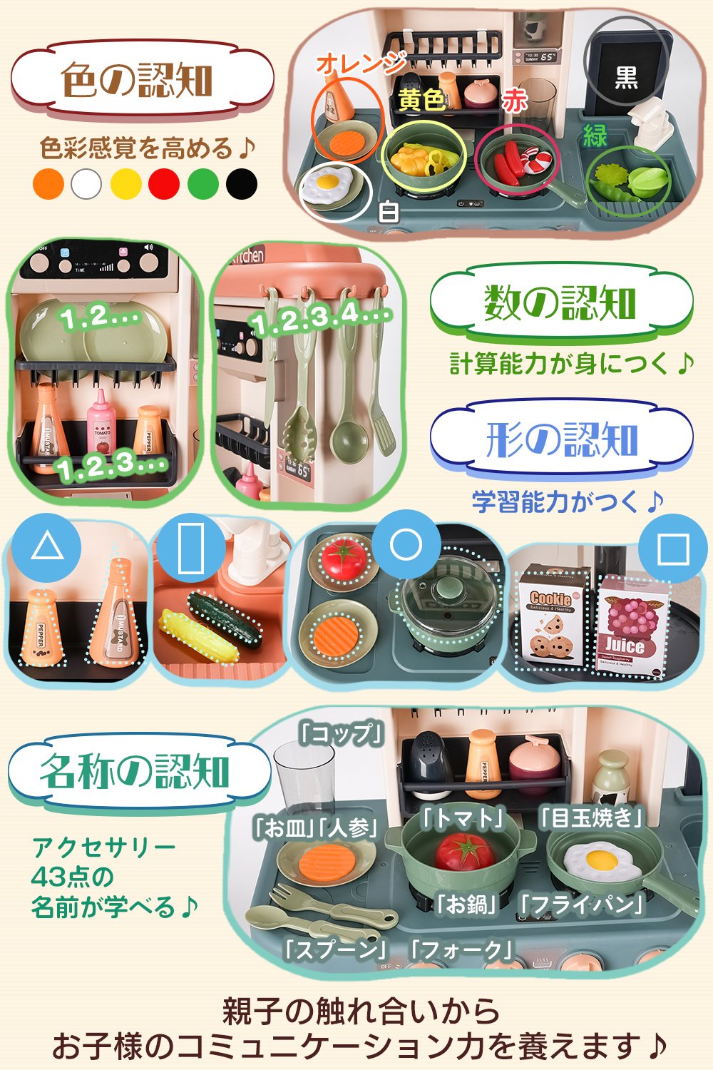 【子供たちの想像力をかきたてる、知育玩具♬】豊富な43点アクセサリーも付属しており、自分で食材を選ぶことにより、子供たちの想像力も豊かに育ち、お料理の楽しがグッと広がります。数を数えたり、色や形・名称を覚えたり自然と知識が広がります。